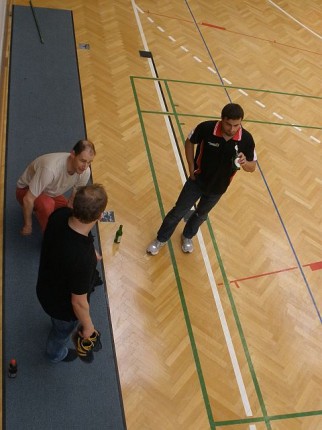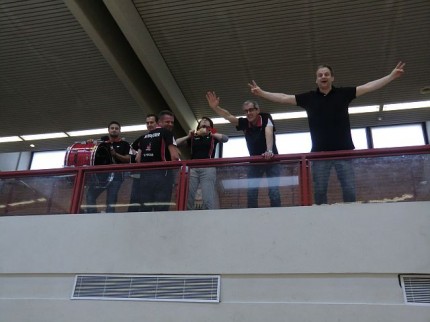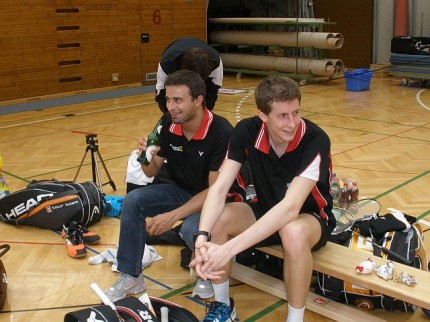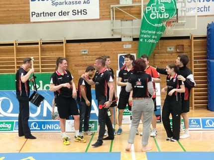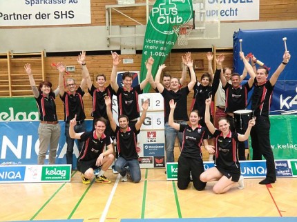 Da haben die Klagenfurter ganz schön geschaut, als das Hooliganteam aus Wolfurt recht lautstark einlief. Das erste Herrendoppel hat bewiesen, dass 6 Wolfurter Fans die Klagenfurter Fangemeinde übertönen kann. Nicht nur auf dem Spielfeld, auch auf der Fantribüne ging´s sehr fair zu. Insbesondere das 1. HD hat den Fans alles abverlangt. Schreien, trommeln, pfeifen, tröten,… bis das 28:26 im dritten Satz geschafft war. Natürlich waren die Fans durstig. Nach der ersten Runde war das Bier ausverkauft! Kaum zu glauben. Dabei hatten die Klagenfurter noch den Tipp bekommen, dass einige Fans aus Wolfurt anreisen würden. Zum Glück gab´s noch Radler. Und für einen speziellen Fan gab´s auch nen Kuchen. Das hat die Fans für die folgenden Spiele gestärkt. Es hat Spaß gemacht, der Mannschaft zuzusehen. Als Jan seinen letzten Punkt machte, der Sieg besiegelt war, trat Freudentaumel – auf Feld und Tribüne – aus. Die beste Mannschaft und die beste Fangemeinde haben zusammen gefeiert. Die Welle von der Mannschaft für ihre Fans und die Welle der Fans für ihre Mannschaft! Nach dem Fototermin ging´s für die Mannschaft wie üblich mit nem Bier, sorry, Radler, unter die Dusche. Jetzt waren auch die Radler ausverkauft. Wir haben´s geschafft!