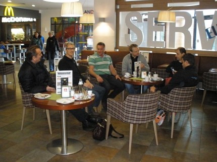 Die erste Pause machten die Hooligans in Salzburg, Raststaton Walserberg. Und wer war noch dort? Die Schülermannschaft aus Dornbirn, begleitet von Waltraud und Josef, die sich auf dem Weg zur ÖMM nach Vorchdorf befanden. Die Welt ist klein! Ne Runde Kaffee für die Fans.