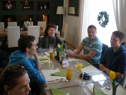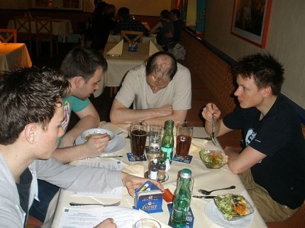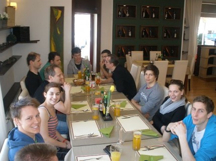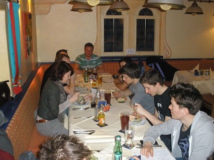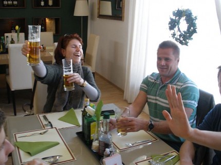 Den Abschluss bildete ein gemeinsames Abendessen im Sudhaus, bevor die Mannschaft mit dem Zug Richtung Wien aufbrach. Die Fangemeinde deckte sich noch mit Bier und Gummibärchen ein, René legte mehr Wert auf – die Fledermaus. Zum Glück behielten unsere Fahrer Michael und Gerhard die Nerven. Die Fahrgäste waren nicht sehr pflegeleicht. Nach rasanter Fahrt waren alle schon vor 1 Uhr im Ländle.