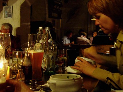 Als es dunkel wurde, brachte uns ein Taxi auf einen nahegelegenen Hügel zu unserem Törggele-Gasthaus. Die Stimmung war dank Weißbier (!?) und der Klostertaler-Hintergrundmusik ausgezeichnet, bis Leite uns eröffnete, dass in seiner am Nachmittag verlorengegangenen Geldtasche auch seine Metro-Karte war. Wirklich ein tragischer Verlust!