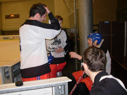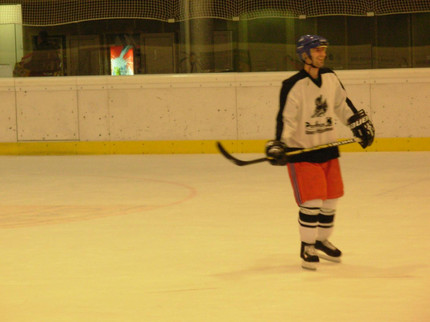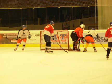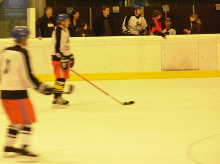 Wie bereits aus dem Artikel von unserem X-Obi herauszulesen war, können wir seit Samstag den 23.2. einen weiteren Erfolg in der Ära des neuen Sportwarts verbuchen. Aber nun chronologisch: Am Turnerball hat unser Präsident nach einer neuen Herausvorderung gesucht und die Turner zu einem Eishockeymatch herausgefordert. Von Anfang an war klar, dass hier Körpergröße auf Flinkheit treffen würden. Zumindest war das unsre Hoffnung, denn im Schnitt waren sie ca. 1 Kopf größer. Zudem war bei uns die Tormannfrage bis zum Umziehen nicht geklärt. Aufopfernd stand dann mit dem Anpfiff unser Sportwart (zum ersten Mal) im Kasten. Zwar etwas ungelenk mit der schweren Ausrüstung, aber siegesbewußt. Bereits kurz nach dem Anpfiff führten wir nach einem Kraftakt mit 1:0. Einige Turner hofften noch auf einen Zufallstreffer, aber unsre Cracks spielten groß auf. Speziell Mary war eine ständige Gefahr vor dem Tor, so war es dann auch kein Zufall, dass sie einen Treffer beisteuerte, der dank Damentorregel sogar doppelt zählte. Erwähnenswert waren dann noch ein gewaltiger Schlagschuss vom schönen Michi von der blauen Linie, der aber durch eine Glanzparade des Turnergoalies aus dem Kreuzeck gefischt werden konnte, die feine Technik der Eberle-Brothers, der großartige Einsatz unseres Youngsters Kevin und "Oldies" Peter, eine Glanzparade Marke "Olli Kahn" unseres Sportwarts als er einen Puck aus 2m Höhe herunter fischte, die unverkennbare Spielweise unseres Präsidenten und die "wahnsinnige" Eissicherheit manches Turners. Am Ende kamen wir zu einem ungefährdeten 8:4 gegen den Wolfurter Turnverein. Somit muss man unserem Präsidenten zu seiner Einschätzung unsrer Fähigkeiten und wohl aber auch dem Sportwart zu einem weiteren Erfolg gratulieren. Ein spezieller Dank geht auch an die Harder Freizeitanlagen, die uns mit hervorragendem Material und besten Eisbedingungen versorgten.